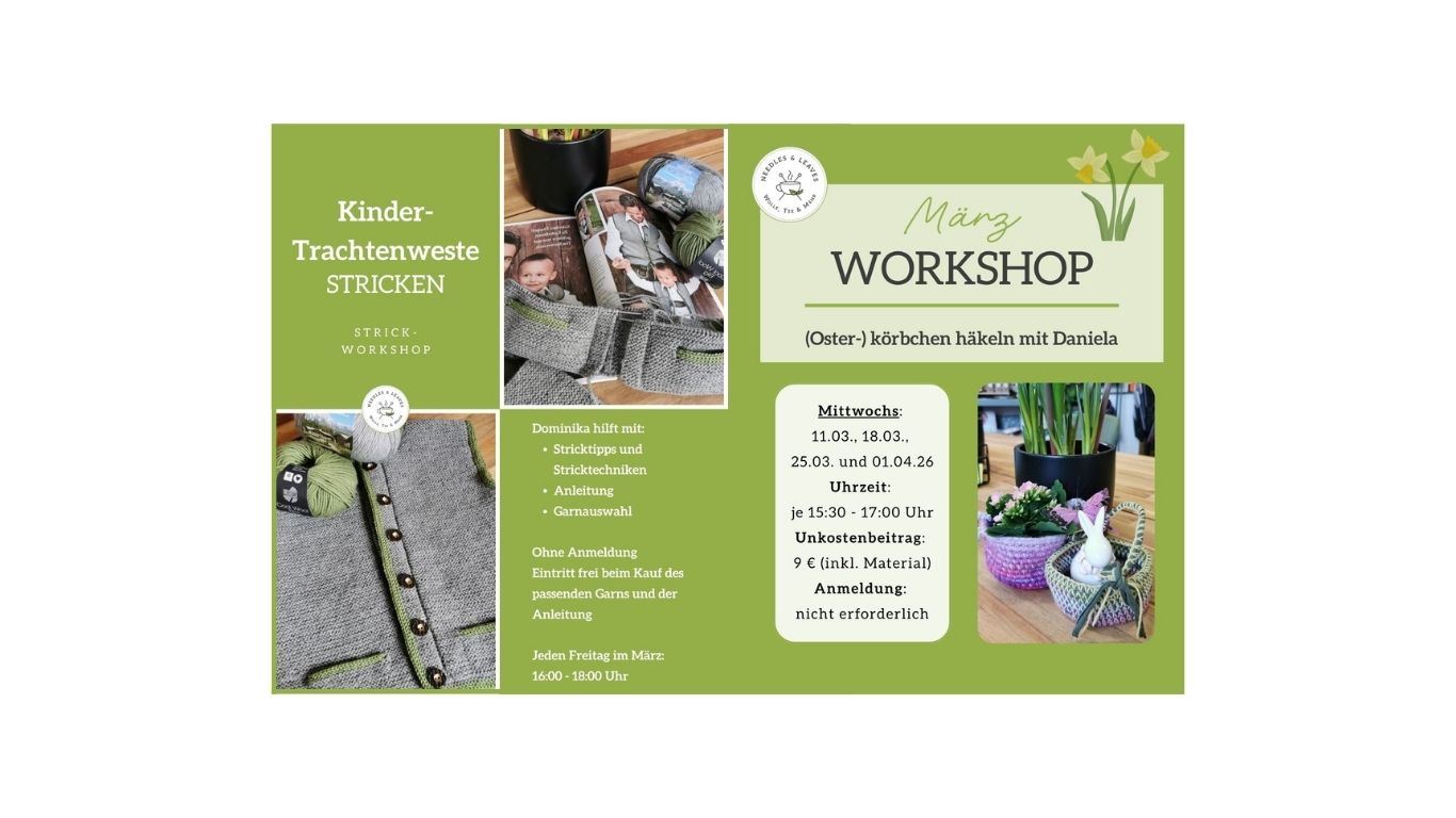 Handarbeitstreffs: jeden Mittwochvormittag von 10:00 - 13:00 Uhr und jeden zweiten Donnerstagabend von 18:00 - 21:00 Uhr